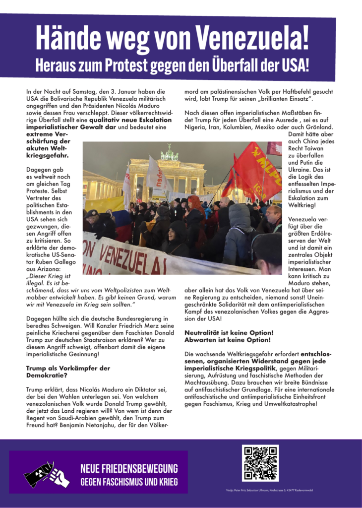 - Hände weg von Venezuela!In der Nacht auf Samstag, den 3. Januar haben die USA die Bolivarische Republik Venezuela militärisch angegriffen und den Präsidenten Nicolás Maduro sowie dessen Frau verschleppt. Dieser völkerrechtswidrige Überfall stellt eine qualitativ neue Eskalation imperialistischer Gewalt dar und bedeutet eine extreme Verschärfung der akuten Weltkriegsgefahr.